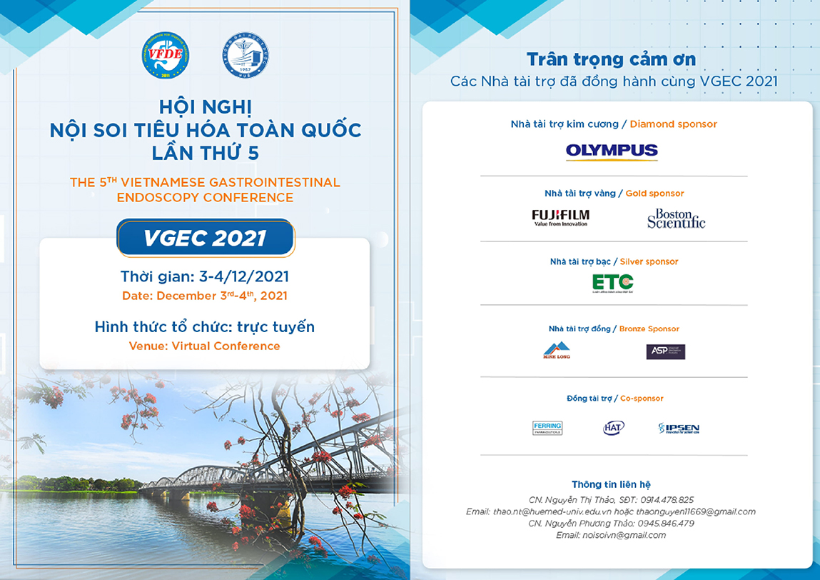 ETC kính mời Quý Bác Sĩ và Quý Đồng Nghiệp đăng ký tham dự Hội Nghị Nội Soi Tiêu Hóa Toàn Quốc Lần thứ 5 năm 2021 (The 5th Vietnamese Gastrointestinal Endoscopy Conference – VGEC 2021) được phối hợp tổ chức bởi Liên chi hội Nội soi Tiêu hóa Việt Nam và Trường Đại học Y Dược Huế